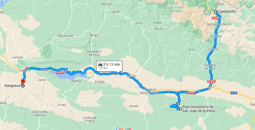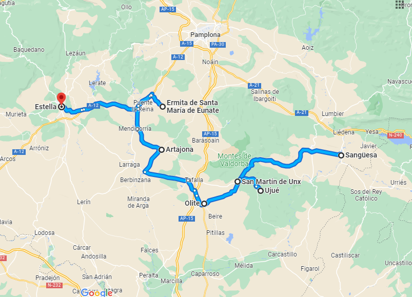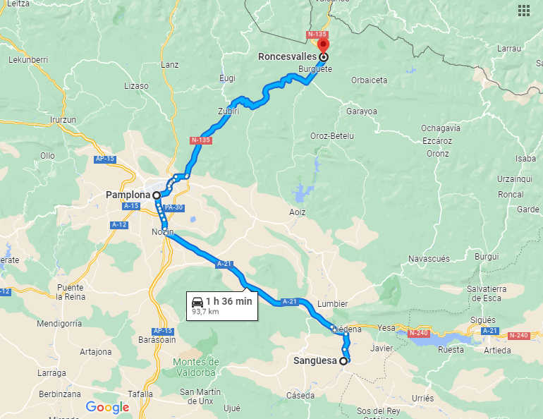 El Camino de Santiago comienza en dos sitios diferentes, en Roncesvalles, (.Navarra ) y Somport (Huesca) En 2008. Hice Somport à Puente la Reina y Roncesvalles a Puente la Reina. Estuve alojado en el Hotel Yamagochi de Sanguesa. El Camino de Roncesvalles a Sangüesa, discurre a veces al lado de la carretera entre árboles, hay que pasar por un puerto y después va en descenso hasta Pamplona.