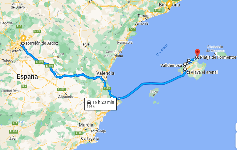 Salimos en autobús hacia Valencia y allí tomamos un barco hasta Palma de Mallorca, visitamos Palma, Manacor, dónde hacen los famosos collares de perlas cultivadas en las ostras, Portocristo y las famosas Cuevas del Drach, Sóller y el Torrente de Pareis. La vuelta a Madrid en avión.