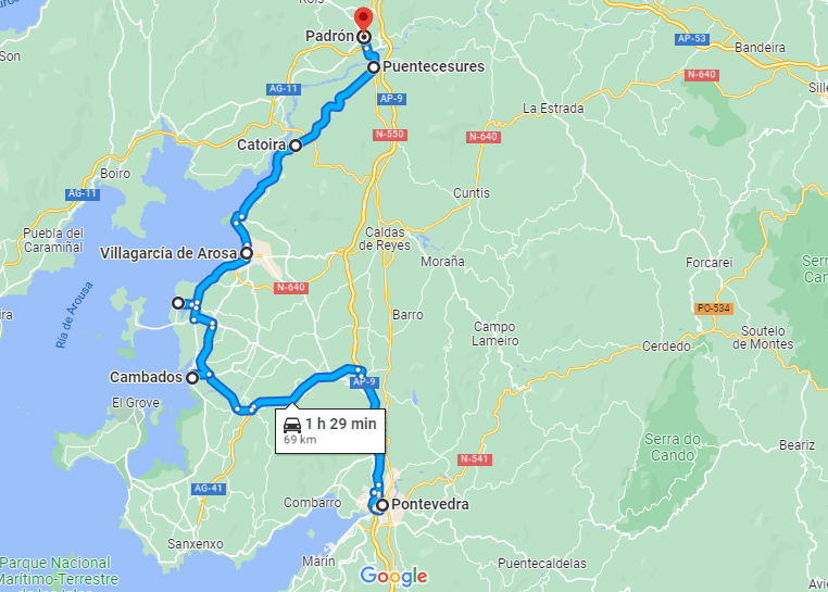 Esta ruta, fue la primera que hice en 1965, y las fotos que tengo en Blanco y Negro son de muy mala calidad. Padrón es famosos, porque según la tradición, está la piedra, en la que el Apóstol Santiago, ató su barca, cuando llegó a Galicia. Vete tú a saber ¡, Ahora dicen que nunca estuvo en Galicia.