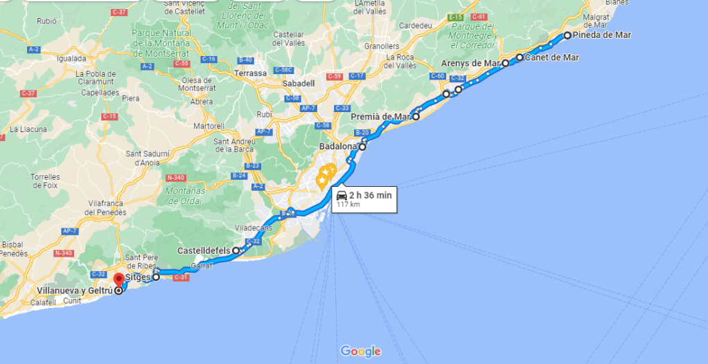 Y por el sur, conozco Castelldefels, sin fotos y ya la primera Sitges. Ciudad con mucho modernismo y buenas playas. Bien comunicada con tren y Bus.