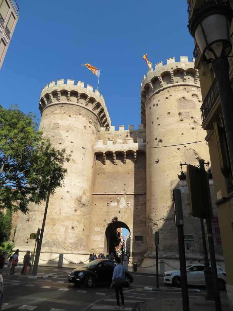 Las Torres de Quartz y de Serranos, puertas de las antiguas murallas, la Lonja de la Seda y el majestuoso Palacio del Marqués de Dos Aguas en la foto grande.