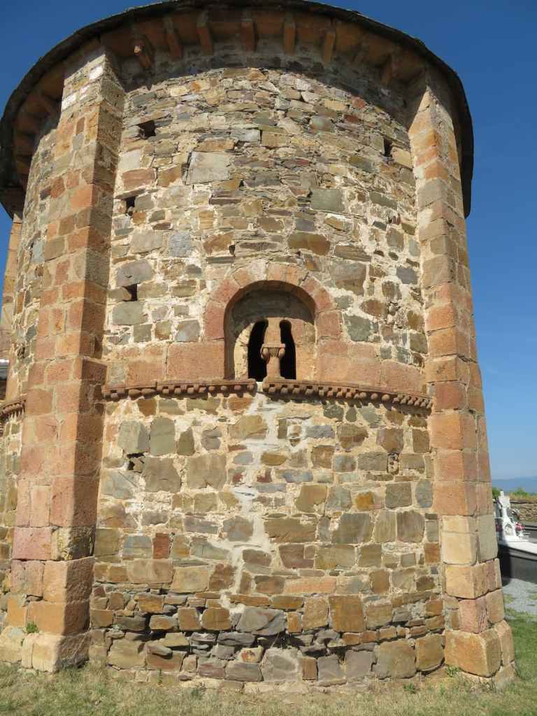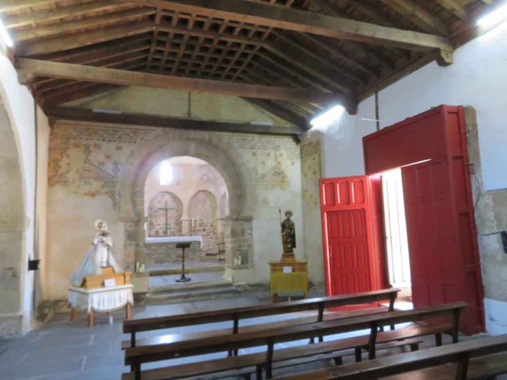 2.-Santa María del Vizbayo, está en el lado opuesto de la ciudad, también en alto, y con el cementerio pegado al ábside. Cuando llegué había una señora, que me explicó la Iglesia de cabo a rabo, con anécdotas y queriendo buscar algo más. Es una joya del románico, con una sola nave, con cabecera semicircular, hecha de sillarejo con sillares irregulares, la nave cubierta por bóveda de cañón, sus arcos de herradura rebajados y la ventana del testero son las características más peculiares. Del siglo XI, con reminiscencias mozárabes, hacen que posiblemente sea la iglesia románica más antigua del Bierzo.