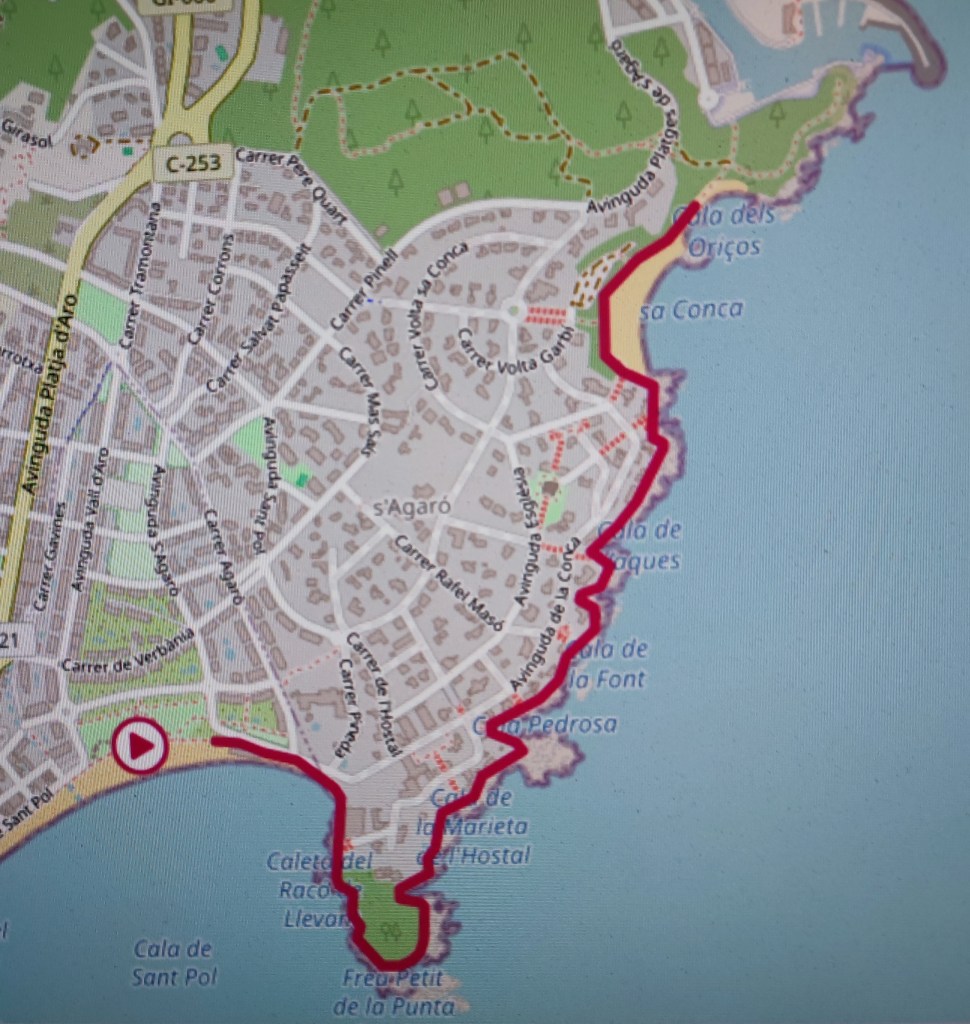 Es muy corta, son sólo 2 km, pero es muy bonita. Luego tienes unos 3 km de recorrido urbano hasta el centro de Platja d’Aro.