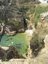 Bordeándolas por detrás, y entre árboles, llegamos a una pequeña cala de arena, que es nudista.