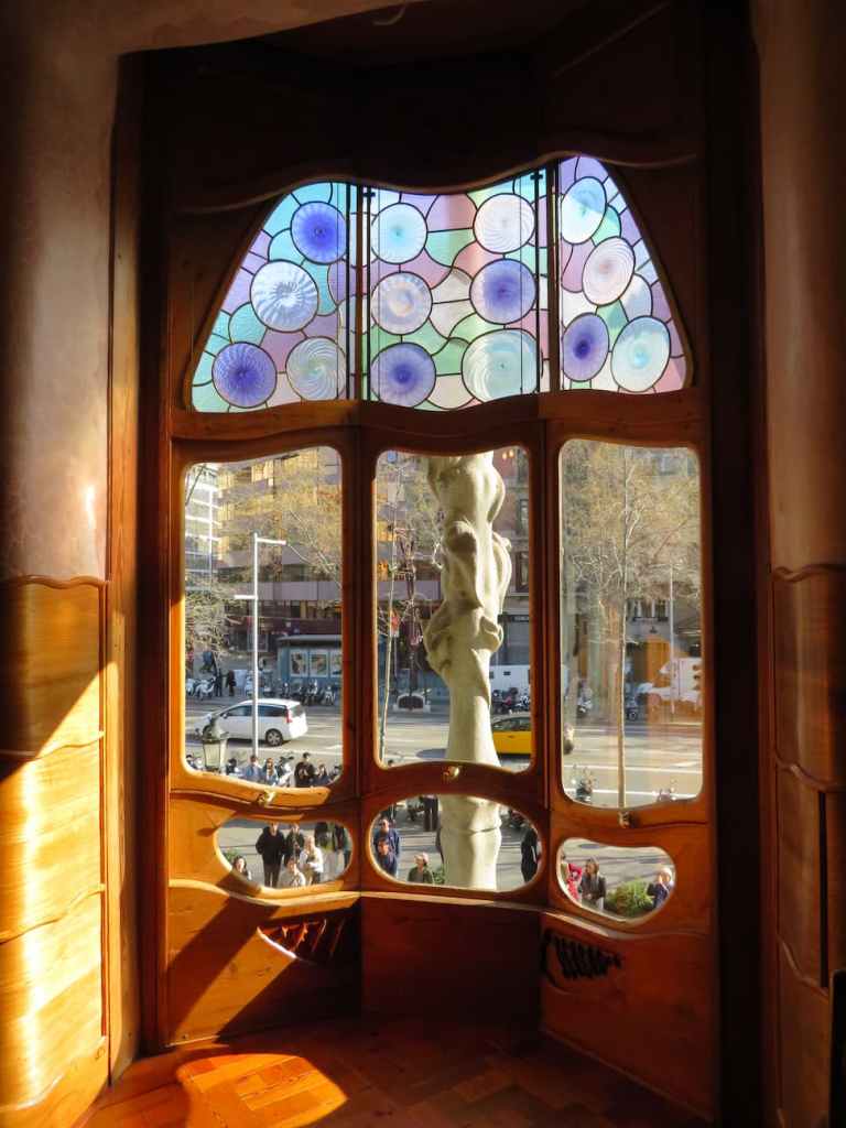 En esta escapada, visité la Casa Batlló. una de las obras más interesantes de Gaudí. El único problema, la gran afluencia de visitantes, un martes entre semana en febrero. Prácticamente no había distancia entre un grupo y el siguiente, lo que dificultaba un poco la toma de fotografías. Construida de 1904 a 1906, su promotor fue el empresario textil Josep Batlló. Ya sabéis que la Industria Textil era muy importante en Barcelona. Situada en el Paseo de Gracia, lleno de edificaciones de burgueses de la época que les gustaba este paseo. Realmente es una rehabilitación del edificio que había anteriormente. Con una nueva fachada. Utilizó piedra, vidrio, cerámica y hierro, que al incidir el sol en la misma producía un juego de luces y sombras.