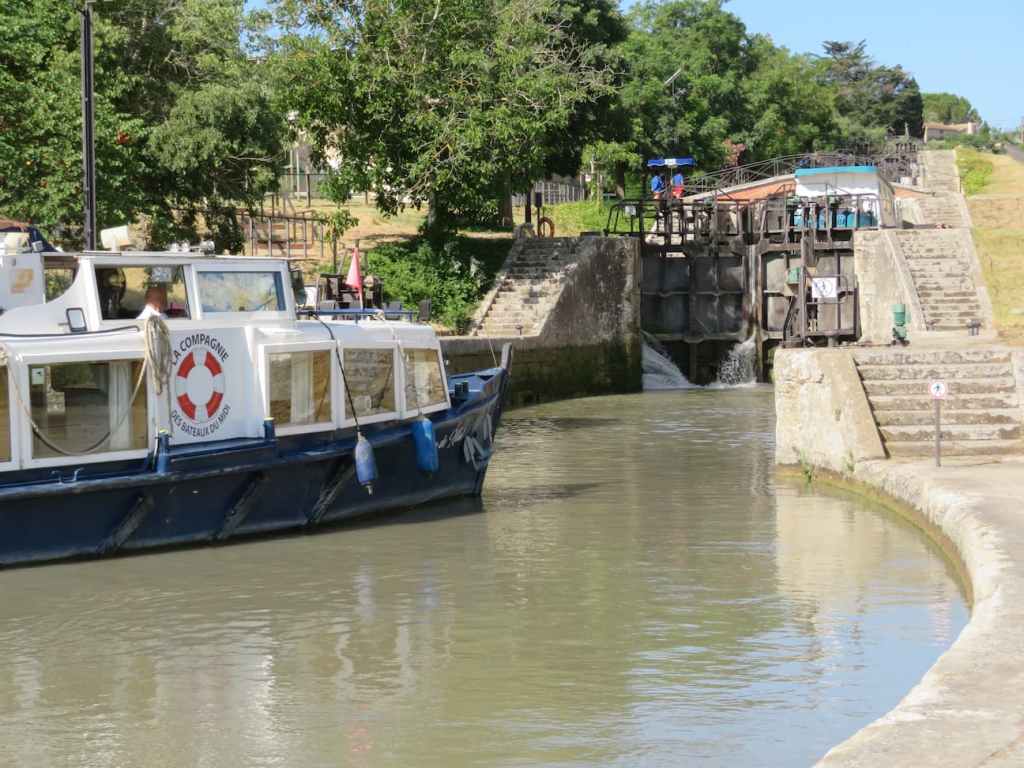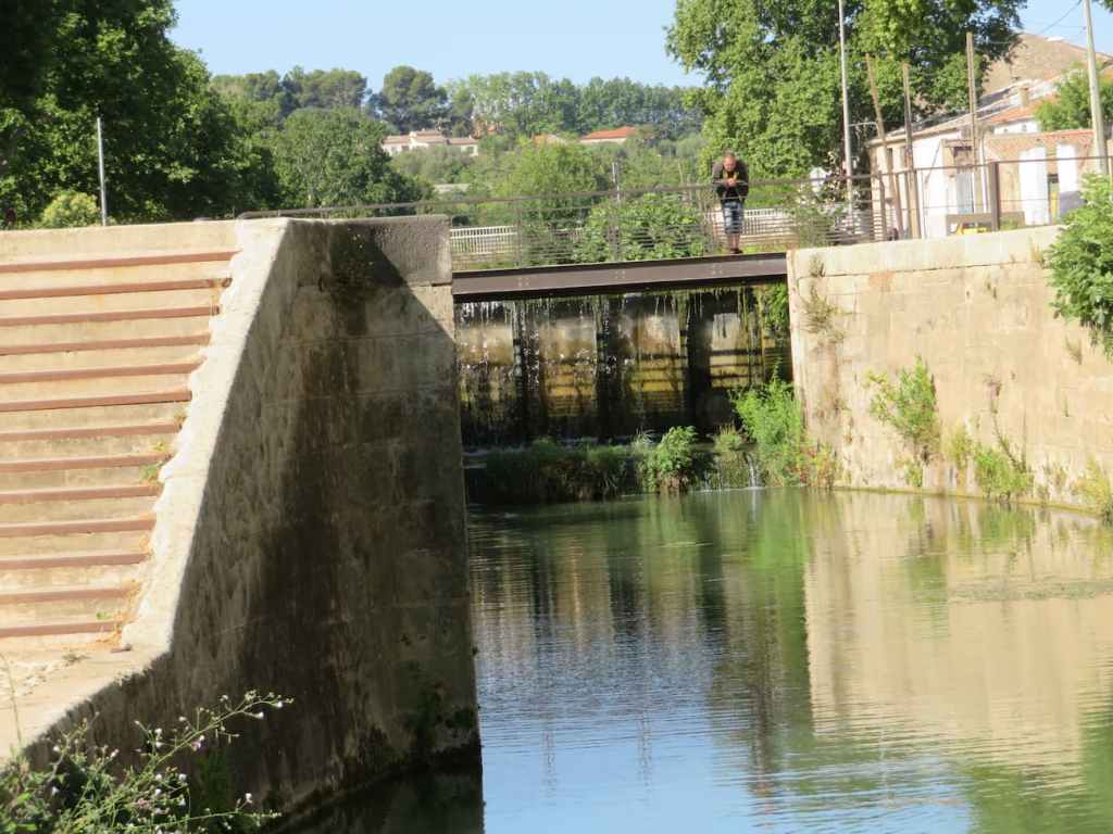 Por otra parte, la Obra del Canal del Midi, atraviesa Francia, del Atlántico al Mediterráneo. Es una obra de ingeniería enorme para la época en que se produjo. Es navegable y antaño se utilizaba para mercancías. Hoy está para usos turísticos. Y aquí en Béziers, el tramo es muy famoso porque tiene que subir un fuerte desnivel, y hay 9 esclusas para hacerlo. Si alguien no sabe lo que son las esclusas, son unas puertas que hay en el canal. Entra el barco y se cierran por delante y por detrás. Se llena de agua, hasta la altura del siguiente tramo. Entonces se abre la puerta de delante, el barco pasa, se cierra, y se vuelve a rellenar de agua, hasta que quede al nivel del siguiente tramo, así va subiendo en altura.