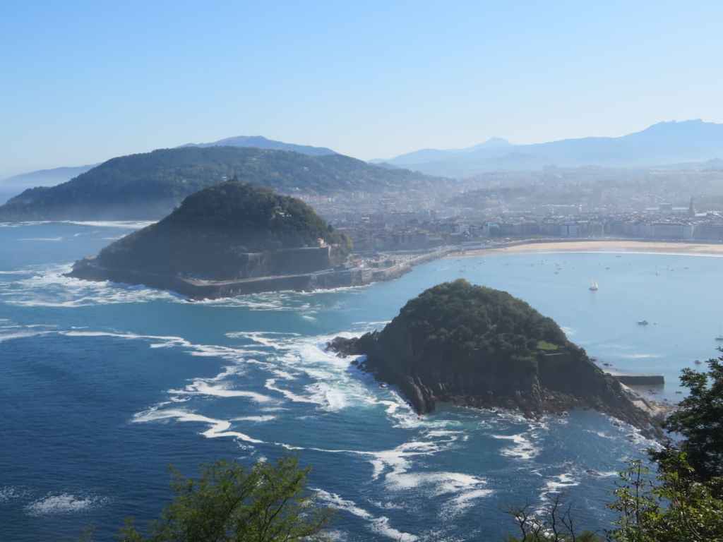 La Bahía con sus dos montañas, el Monte Urgull y el Monte Igueldo, y su parque de atracciones, al que se llega por un funicular. La vista de la Bahía desde allí.