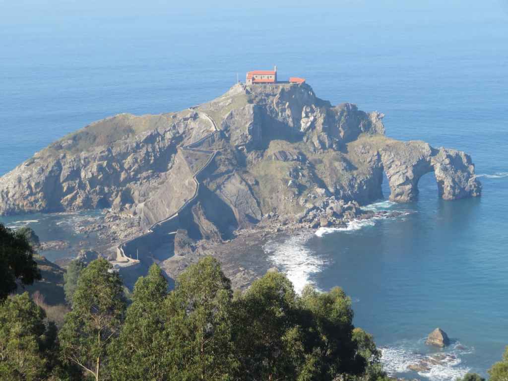 Al día siguiente, me preparé la mochila, para hacer mi ruta , llevaba mucho tiempo queriendo hacerla y mereció la pena. Tomé la carretera que sube hacia el Aeropuerto y desde allí y por carreteras comarcales, llegué a la Playa de Bakio. Como era temporada baja, apenas había dos o tres cafeterías abiertas y como hacía bastante aire, me senté al resguardo en una que estaba en la misma playa, viendo desde mi sitio el inmenso arenal.- Y como a dos o tres km está la entrada a la zona de Gaztelugatxe. Por unas carreteras estrechas, llegué al Parking, donde estaba la entrada. Desde aquí había dos posibilidades, por una carretera sin tráfico, que daba bastante vuelta, pero era cómoda, o dejarte caer por una tremenda cuesta, que menos mal que tenía una barandilla para agarrarse, porque de no ser así, había llegado directamente al agua. Es una pendiente tremenda. Es un sitio, al que hay que ir, con buen calzado ya que si vas en chanclas, te matas directamente. Una vez que llegas abajo del todo, comienzan las casi trescientas escaleras que hay hasta la ermita. El recorrido es espectacular, el mar no estaba muy tranquilo y golpeaban algunas olas, por las rocas. Arriba, no cabe mucha gente, pero al ser marzo, estábamos solo cuatro personas.
