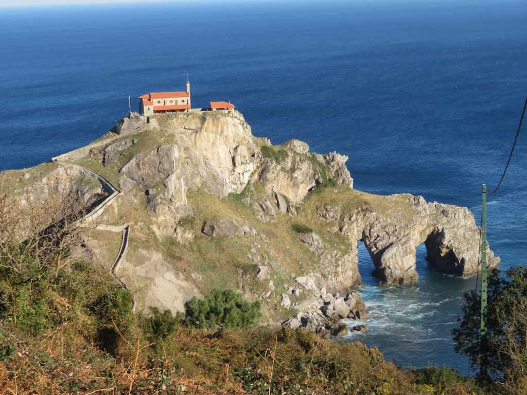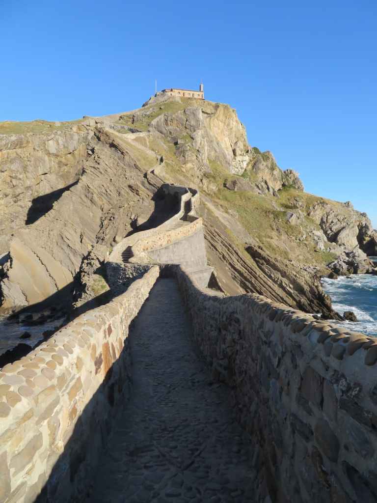 y desde allí a San Juan de Gaztelugatxe, una vez que dejas la carretera general y siguiendo las indicaciones, llegas hasta la entrada, y desde aquí tienes dos opciones. Bajar por una carretera sin tráfico, que da más vuelta, pero es más cómodo o tirarte directamente por la montaña. No es broma. Hay una bajada impresionante, una rampa tremenda, para bajar, y no caes directamente porque hay una barandilla para agarrarse. Pero merece la pena bajar por aquí, por el paisaje, luego vuelve por la carretera. ATENCIÓN, no se puede ir en chanclas porque es peligroso. Una vez que llegas abajo, viene la escalera con 200 peldaños, que va serpenteando hasta la ermita. Allí apenas caben diez o quince personas. Id pronto, pues está muy bonito con poca gente.
